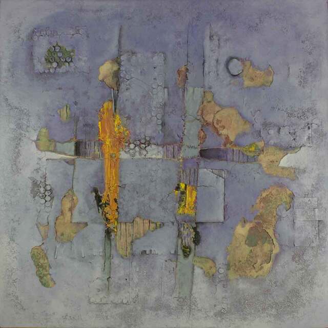 Mixed on canvas, paper and wood, 220 × 220 cm.