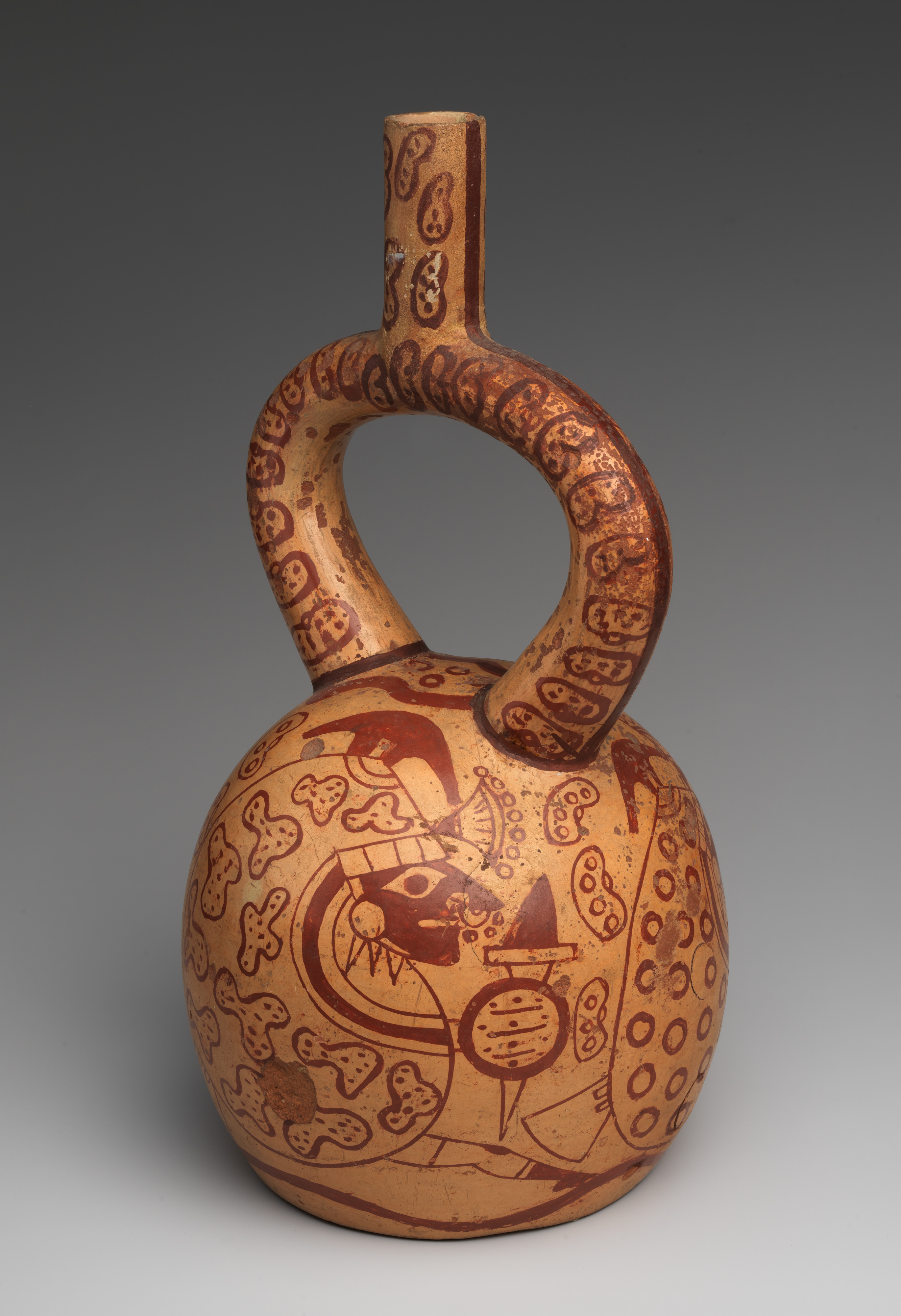Large ovoid stirrup jar. Broad ring base. Rounded body with maximum diameter above center. Broad shoulder with narrow, tubular spout and slightly flaring rim, positioned vertically...