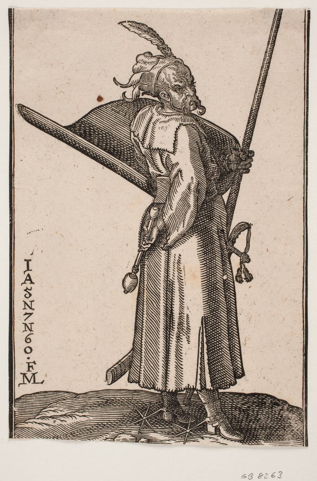 Title: Stående soldat (akinci), profil mod h.; i h. hånd en stridskølle, i v. hånd en lanse, hvis top er uden for øvre indramningslinje; på v. arm et skjold med indersiden vendt opad, ved v. side et sværd