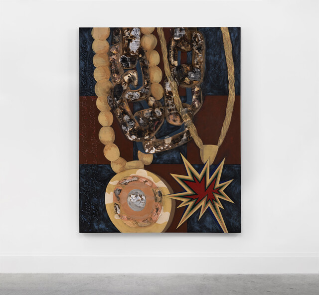 Acrylic, caulk, burned silver rag paper, matte photo paper, acrylic transparency paper, printer paper on wood panel, 96 × 66 in.