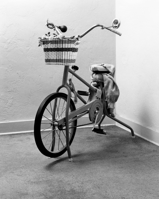Exercise bike, mirror, roses, sweatshirt, horn.