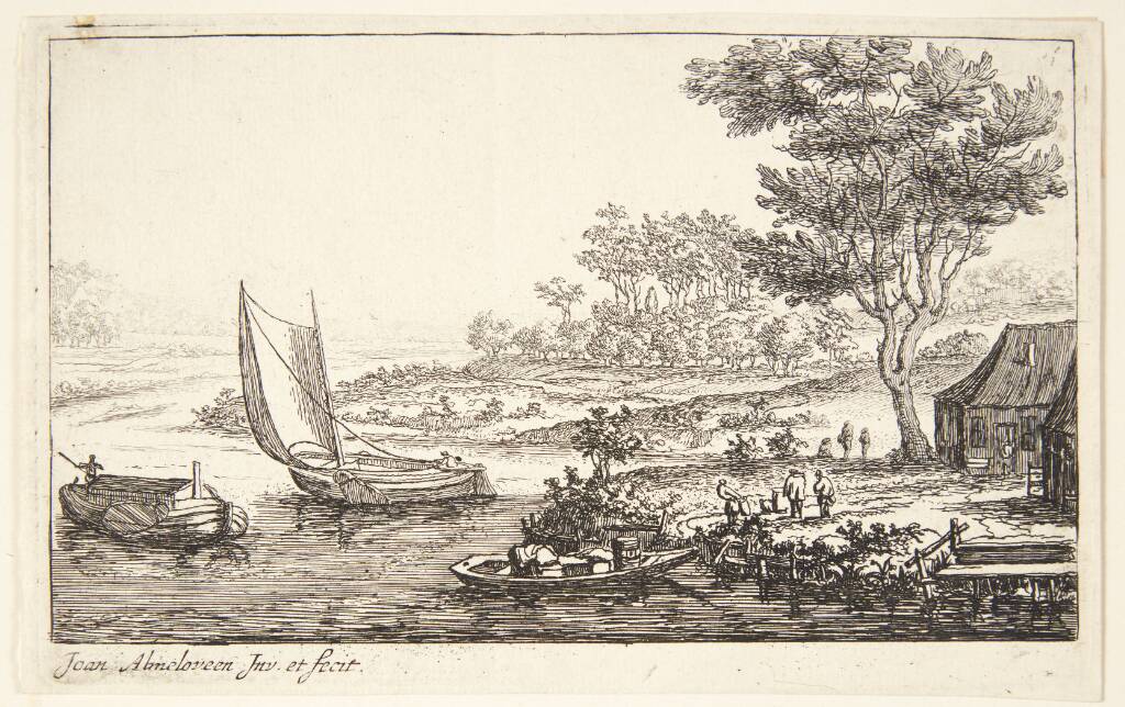 Title: Flodlandskab med et anløbssted og tre både