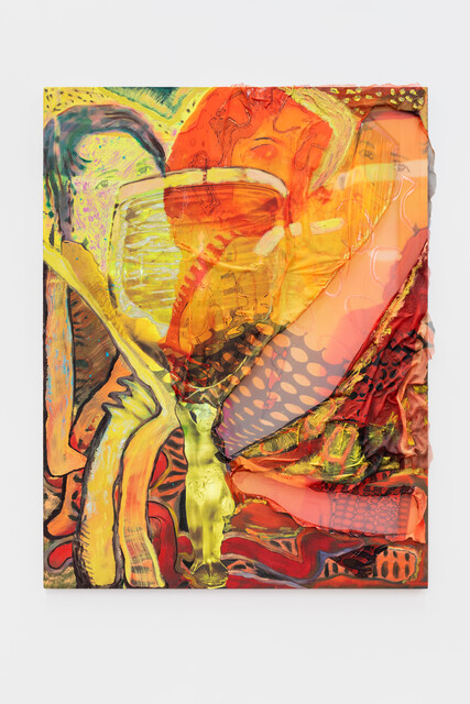 Oil and acrylic paint and digital photocollage print on beach towel and chiffon, 68 × 52 in.
