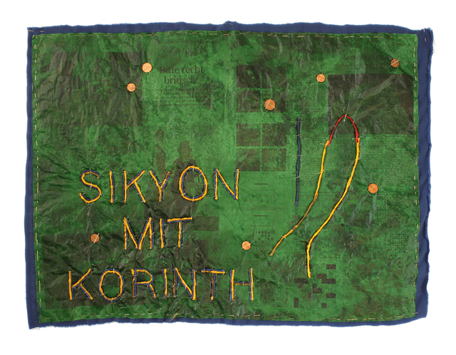 Fabric, news paper, drawing ink, pins, coins, 60 × 80 cm.