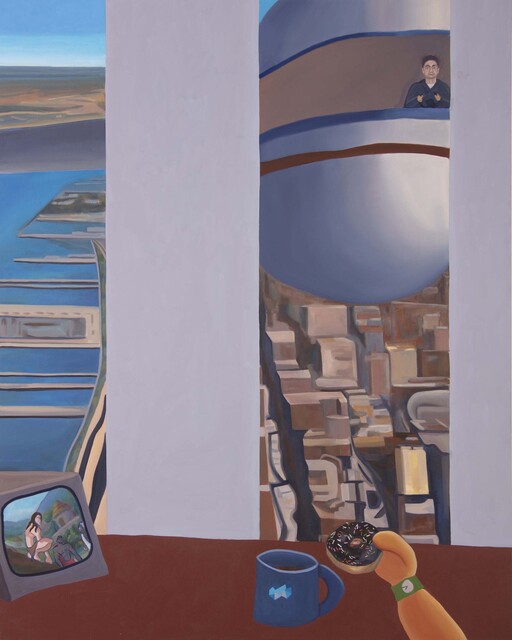 Tanner Simon, 1 WTC (view from Marsh McLennan, including M&M logo on mug and morning Premiere of Tarzan “They Poisoned the River Part II” with chocolate frosted donut w/ sprinkles) (2022)