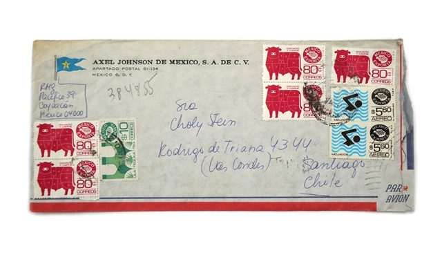 Envelope, ink and artist made stamps, 10.6 × 17.2 cm...