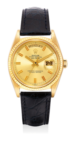 Title: Rolex, A well-preserved and rare yellow gold wristwatch with sweep center seconds, day and date (Circa 1971)