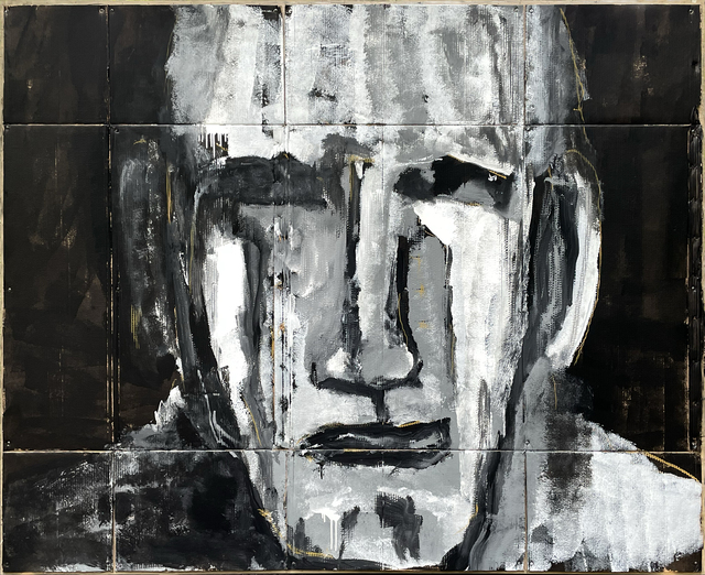 Mixed media on cardboard attached to hand-made distressed wood panel, 74 × 91 × 1 1/2 in.