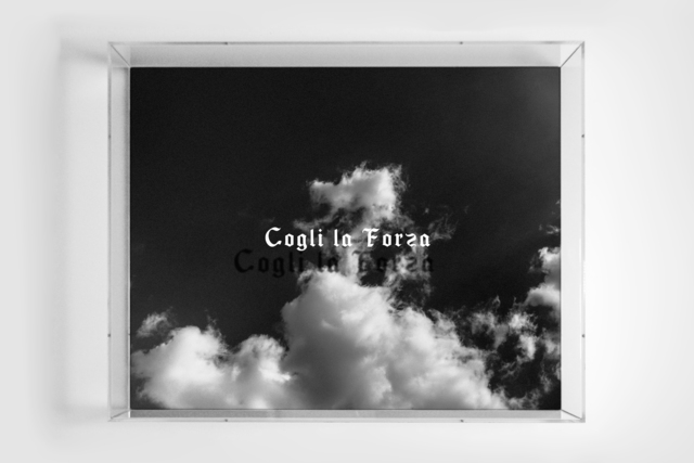 Photography printed on photo rag cotton paper, mounted on aluminium di-bond, optium museum acrylic box, paper letters, flash led light Lendlenser P3.