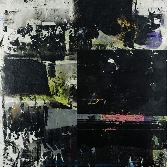 Spray paint, acrylic paint, household emulsion paint, household gloss paint and acrylic varnish on canvas, 157 × 157 × 3 cm.