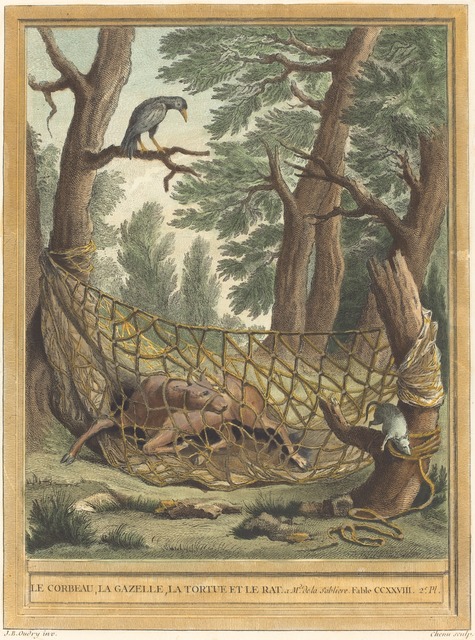 Title: Pierre Chenu after Jean-Baptiste Oudry, Le corbeau, la gazelle, la tortue et le rat (The Crow, the Gazelle, the Tortoise, andthe Rat) (published 1759)