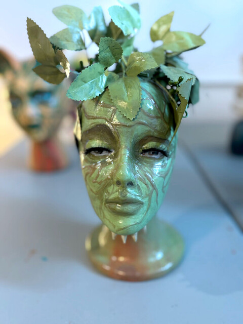 Hand-painted sculpture and mixed media, 11 × 7 × 8 in.