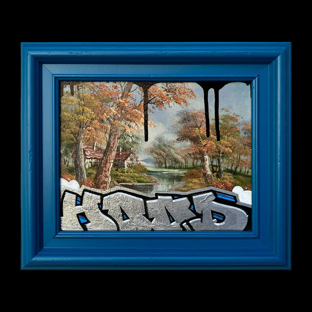 Spray paint and marker on reclaimed framed painting, 29 × 33 × 4 cm.