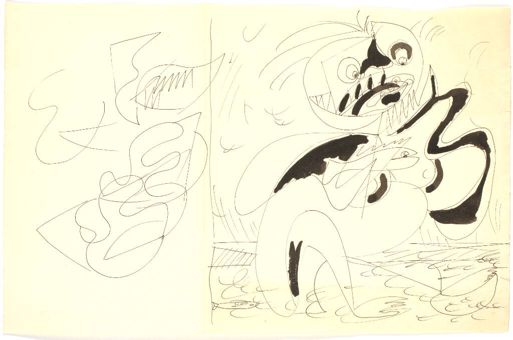 Stående kvindefigur med fisk i strandlandskab; t.v. biomorf abstraktion