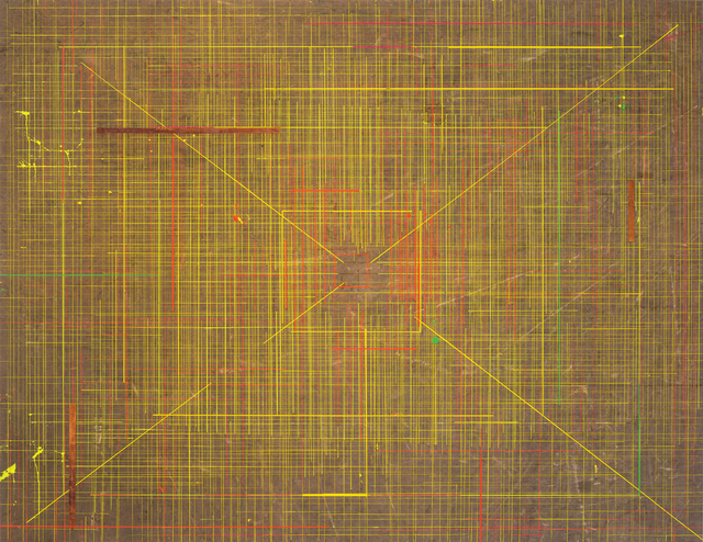 Acrylic, oxidation of cupric emulsion on used truck tarpaulin, 66 131/141 × 86 121/197 in.