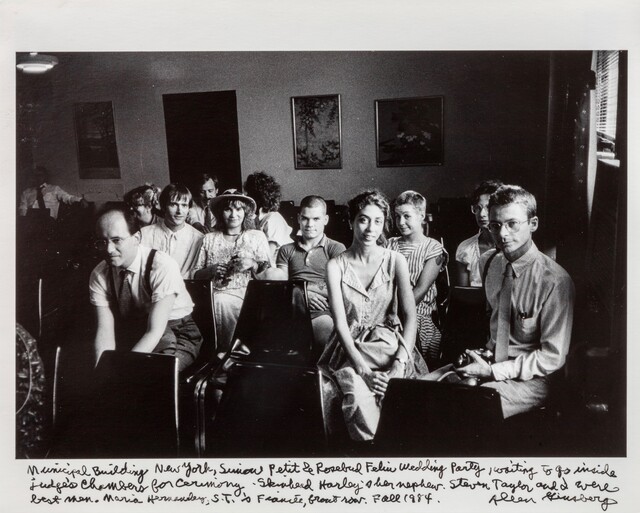 Title: Allen Ginsberg, “Municipal Building New York, Simon Petit & Rosebud Feliu Wedding Party, waiting to go inside judges for chamber, skinhead Harley’s her nephew, Steven Taylor and I were best men, Maria Hernandez S.T.’s Fiancée, Front Row. Fall 1984.” (1984