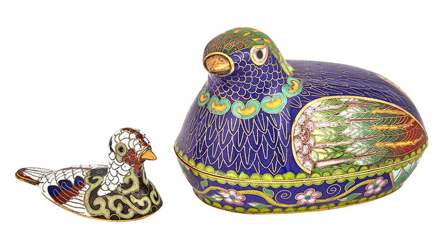 Of resting quail form with enameled feather detailing and a blue body; Together with a Pigeon Form Cloisonné Box Lid.