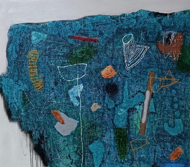 Acrylic, collage, texture on Canvas, 140 × 180 cm...