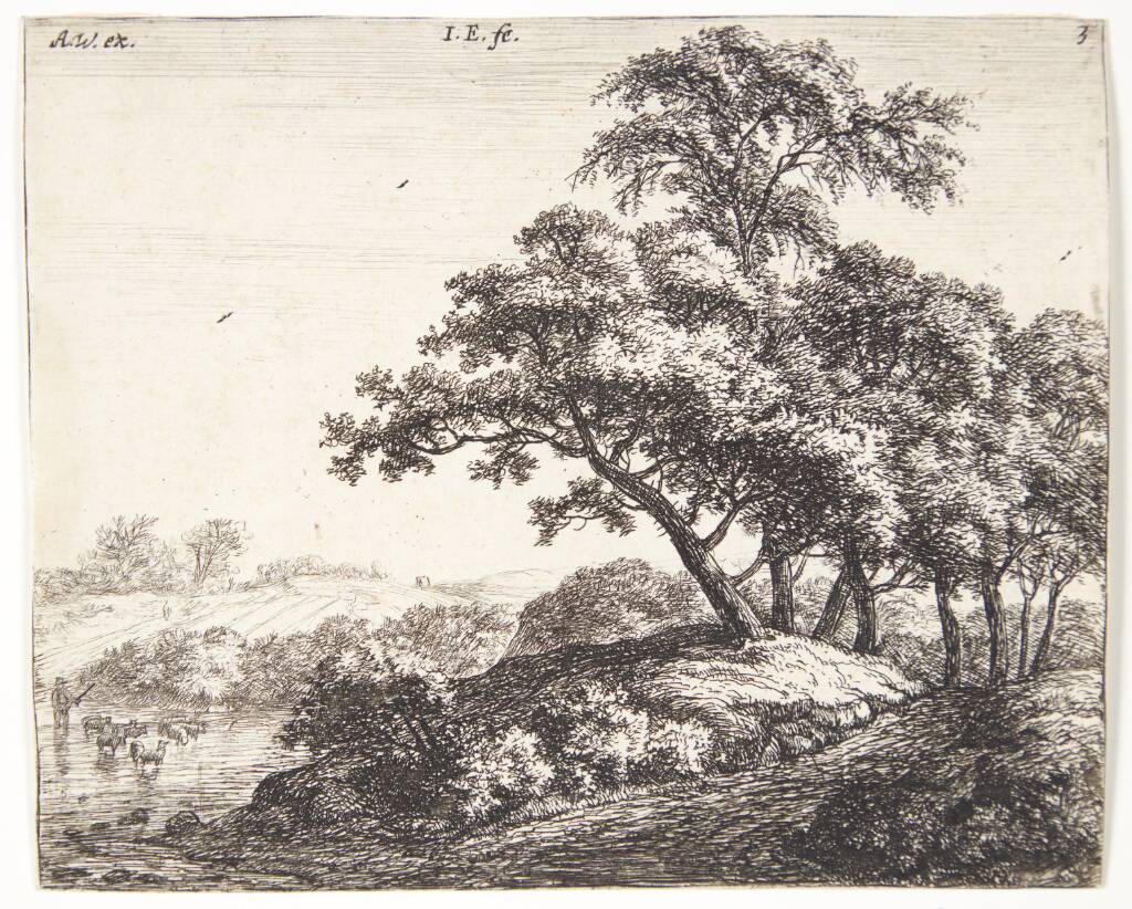 Landskab med gennembrudte grotter, gravmonumenter, en flod og figurer