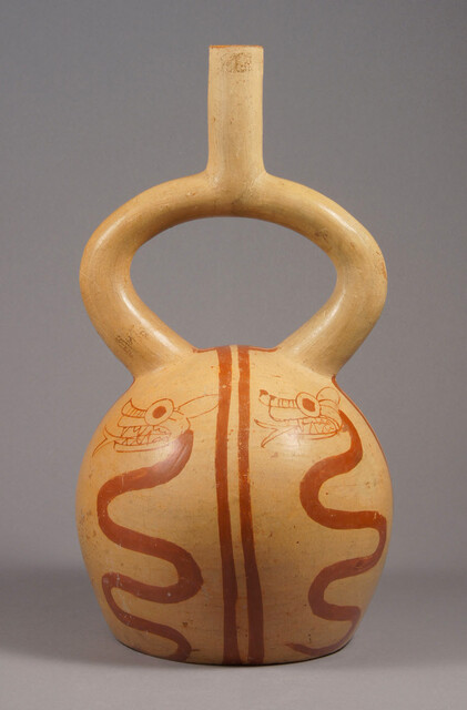 Title: Peru, North Coast, Moche, Moche style, Moche IV Fineline Ceramic Stirrup-Spout Vessel with Serpents (Peru, Moche, North Coast, c. AD 450 , 550)
