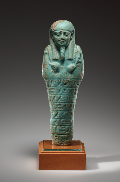 Molded in faience, this ushabti has an uraeus on its forehead (a symbol of royalty) and breasts molded just above the hands, indicating gender. The inscription reads: "May the Osir...