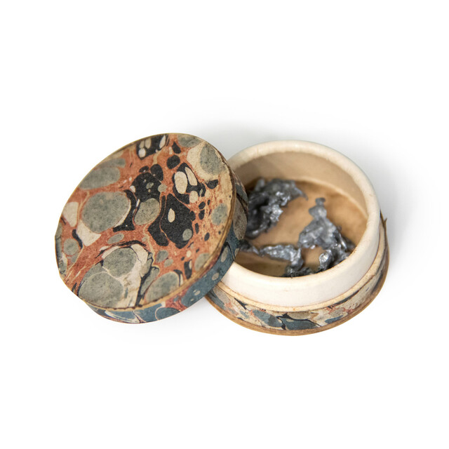 Printed paper on cardboard box and metal fragments, 5/8 × 1 1/2 × 1 1/2 in.