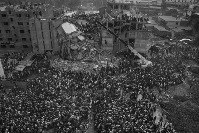Kari Salahuddin Ahmed, A top view of the collapsed building of Rana Plaza from a nearby rooftop. An hour after workers entered the building, it collapsed. It took just 90 seconds. Including rescue workers, 1,134 workers were killed. Nearly 2600 injured. (