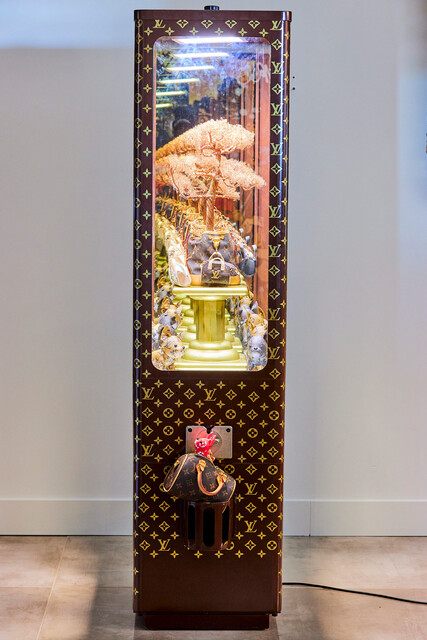 Antique machine / glass / light, 150 × 40 × 40 cm.