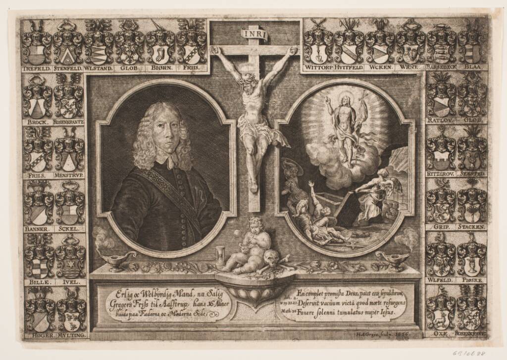 Title: Gregers Friis til Ålstrup samt Kristus på korset og Kristi opstandelse. Omgivet af aneskjolde