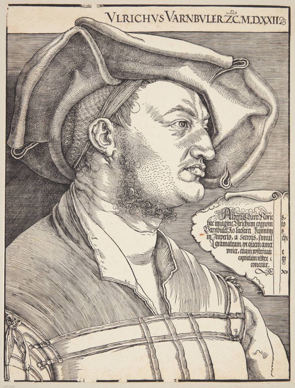 In his woodcut Dürer shows the Swiss jurist Ulrich Varnbüler as a near-foliate chest in three-quarter view with dark background. The artist transferred a chalk drawing, which he al...