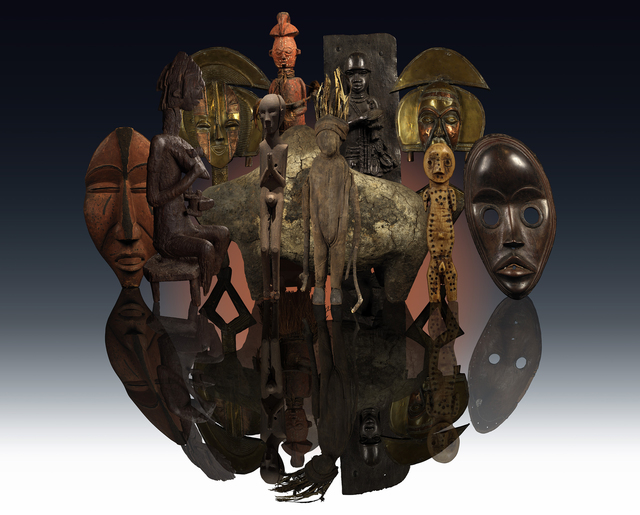 Ken Gonzales-Day, Africa: (left) Republic of Congo, Mask; Mali, Mother and Child for the Gwan Assoc.; Kota Peoples, Obamba or Mindumu groups, Janus Reliquary Guardian Figure; Republic of the Congo, Figure of Hunter; Nigeria, Plaque; Republic of Congo, Fig