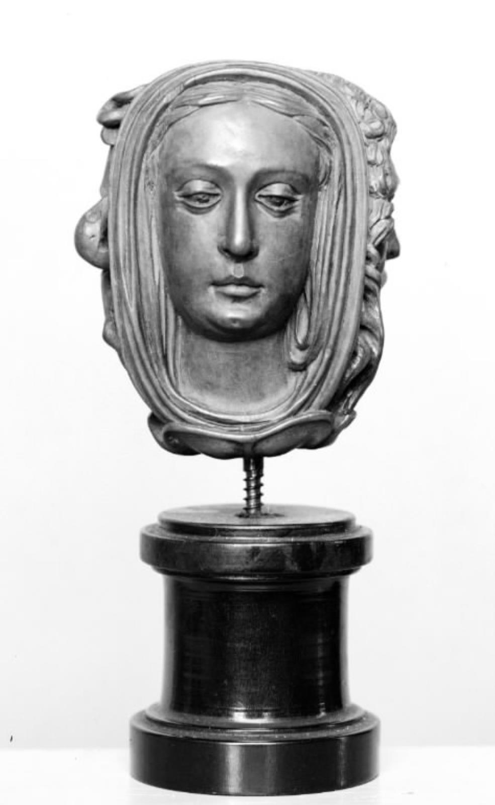 Modeled, engraved and openwork perfume burner in bronze. Cylindrical base with flat bottom and flat rim on which a niche in the shape of a half dome. The opening is framed by a carved rim forming two opposing volutes, with two bird heads in the centre. On