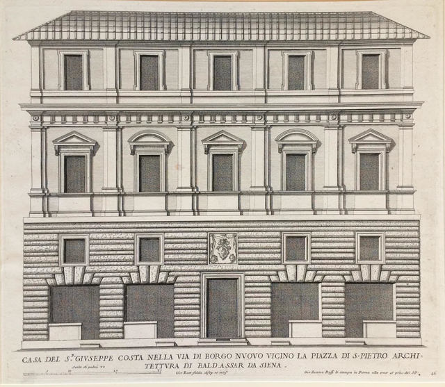 Giovanni Battista Falda, Casa del S Giuseppe Costa nella Via del Borgo Nuovo Vicino La Piazza di San Pietro Architetture di Baldassar da Sienna. Plate 46 from Palazzi di Roma de Piu Celebri Architetti, vol II (1655)