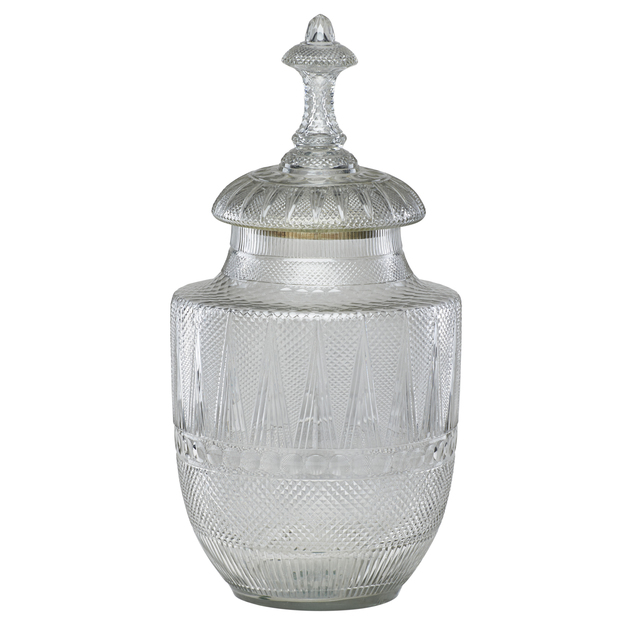 Glass Lidded Urn, with linear, diamond, and concave circular patterns, 26 1/4 × 12 1/4 in.
