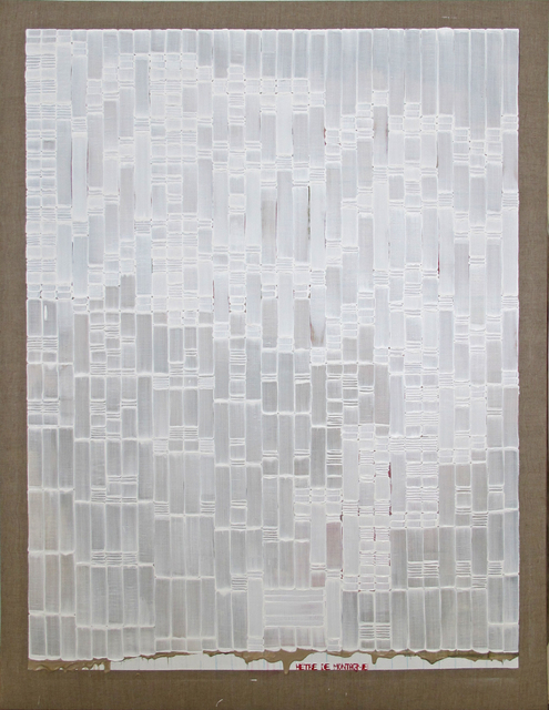 A full portrait of a seated woman, facing left, shown in profile, the whole composition reminiscent of Whistler's portrait of his mother. The woman wears a dark blue pleated dress ...