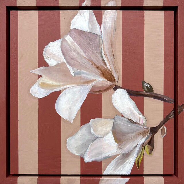 Oil painted magnolia study on salt red and putty stripe, 30 × 30 cm.