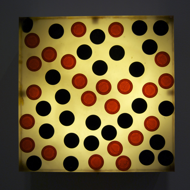 Urethane rubber, mixed media, stainless steel frame and fluorescent light, 12 × 12 × 3 1/4 in...