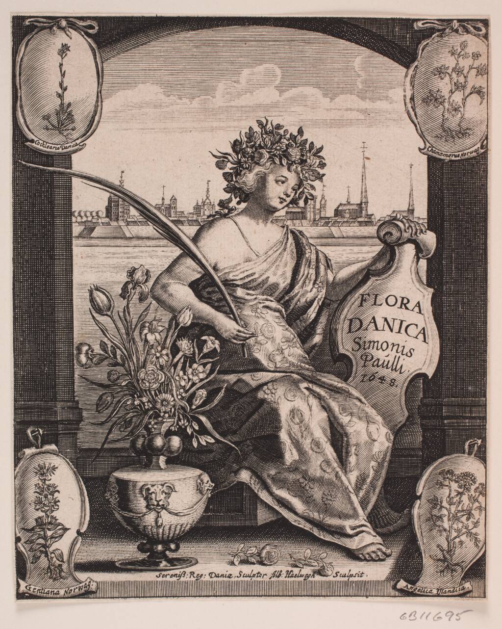 Title: Siddende Flora. Titelblad til Simon Paullis, "Flora danica", 1648