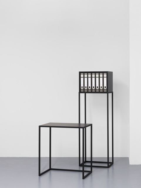 7 dossiers, 297 folhas de papel, 297 bolsas de catálogo, recortes de jornais, estrutura em ferro e MDF lacado de preto; 7 file folders, 297 sheets of paper, 297 punched pockets, newspaper clippings, structure in iron and MDF lacquered in black, cm.