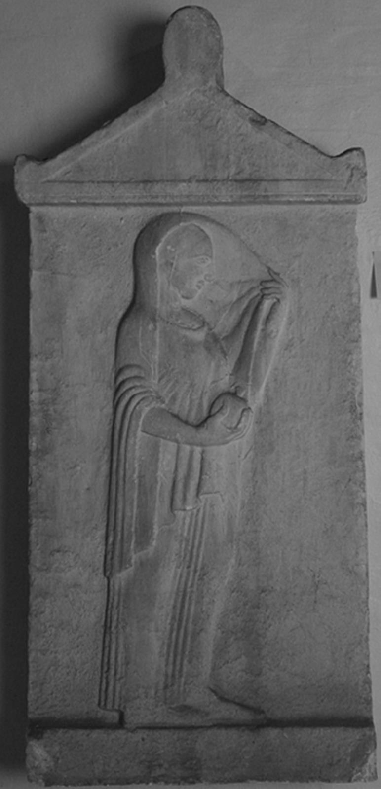 Gravrelief. Gravrelief for Polyxenaia. Stående kvinde i profil mod h. med granatæble i h. hånd