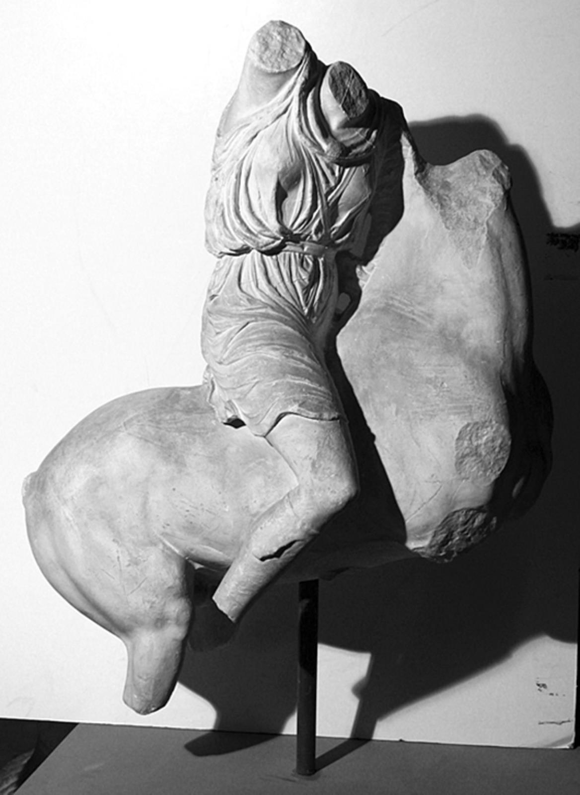 Amazone på stejlende hest mod h. hest