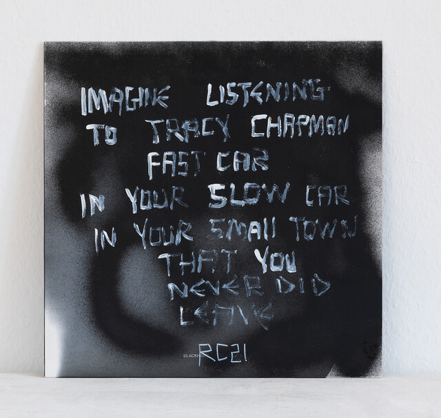 Handsprayed and handprinted Tracy Chapman text piece. On a vinyl 12'' LP Cover, 30.48 × 30.48 × 0.2 cm