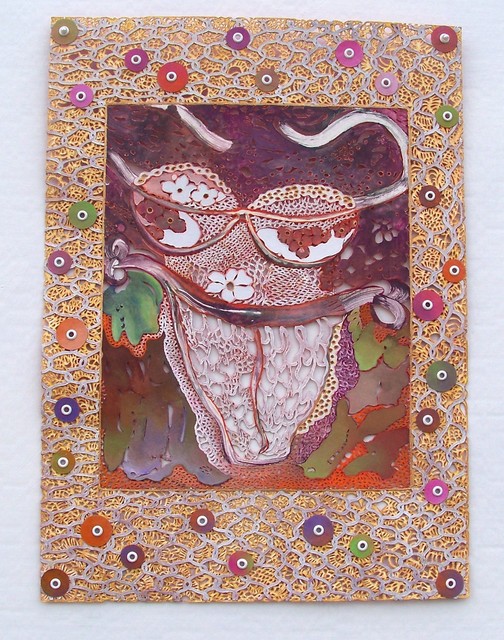 Hand-cut altered mono-type with acrylic and eyelets, 18 × 13 in...