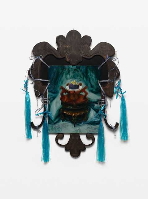 Oil on panel, hand-carved wood structure, wood stain, tassels, findings, 17 × 23 × 3 in...