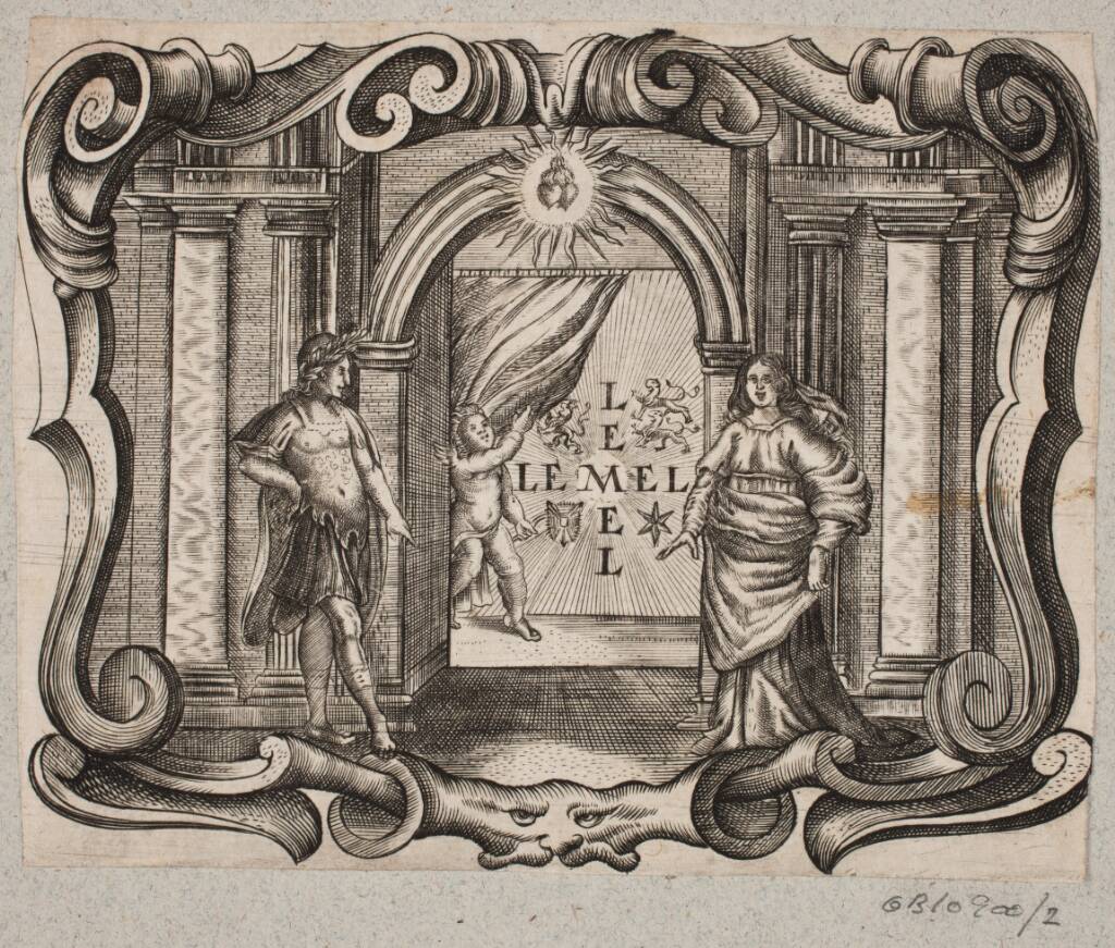 Title: Emblem med portal, mand og kvinde, amorin og to brændende hjerter