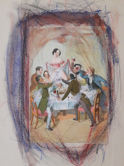 Wax pastel and ink overpainting a historic Peter Fendi Lithograph, 40 × 30.