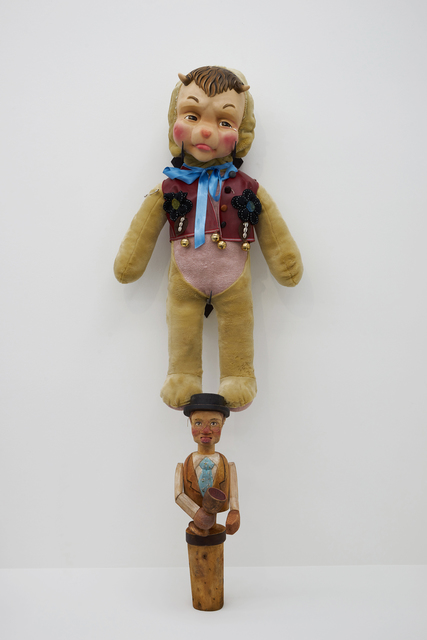 Acrylic and enamel on cast epoxy resin, assorted fabrics, sheep wool and horsehair filling, vinyl, felt and cowry shell waistcoat, ribbon, safety pin, painted and stained carved linden, brass, steel, 200 × 100 × 5.