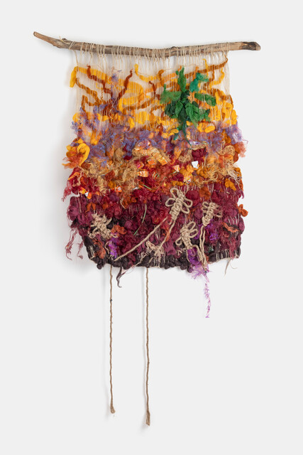 Sisal, jute, wool, organza, naturally dyed cotton from food waste, avocado bags, recycled plastic for tote weaving, Bittersweet tree branch, food wrappers from family, friends, shared meals, and my own consumption, 142 × 122 cm.