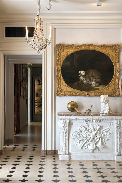 Julien Spiewak, La Lice and his little ones by Jean-Baptiste Oudry (salon of 1753), stove with hunting accessories in faience of Strasbourg (second half of the 18th century), Carole, chandelier from a theater (19th century), porcelain vase Puppie by Jeff