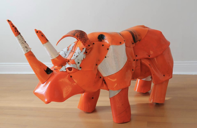 Wood rhino, Chinese umbrellas, sea sponges, linen, beads, pewter soldier, grape vines, glass chandelier drops, acrylic horns, wire, nylon and bead flower, 84 × 36 in...
